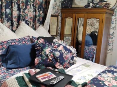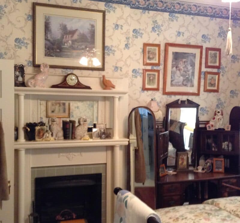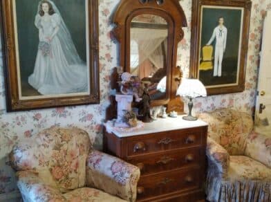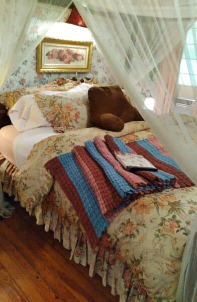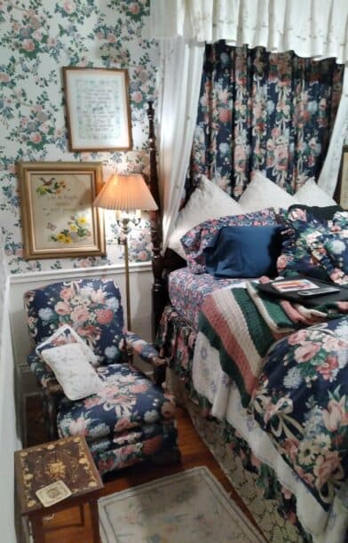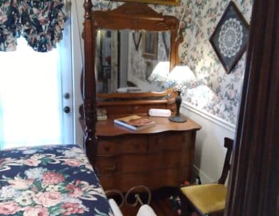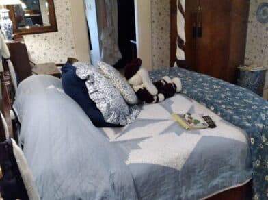 The Paul Stetson Suite boasts an antique hand carved, almost king size, canopy bed with lace and ivy in the canopy. Deep navy and country blue make the room very peaceful while you relax in the bed and watch the bluebirds out the window.